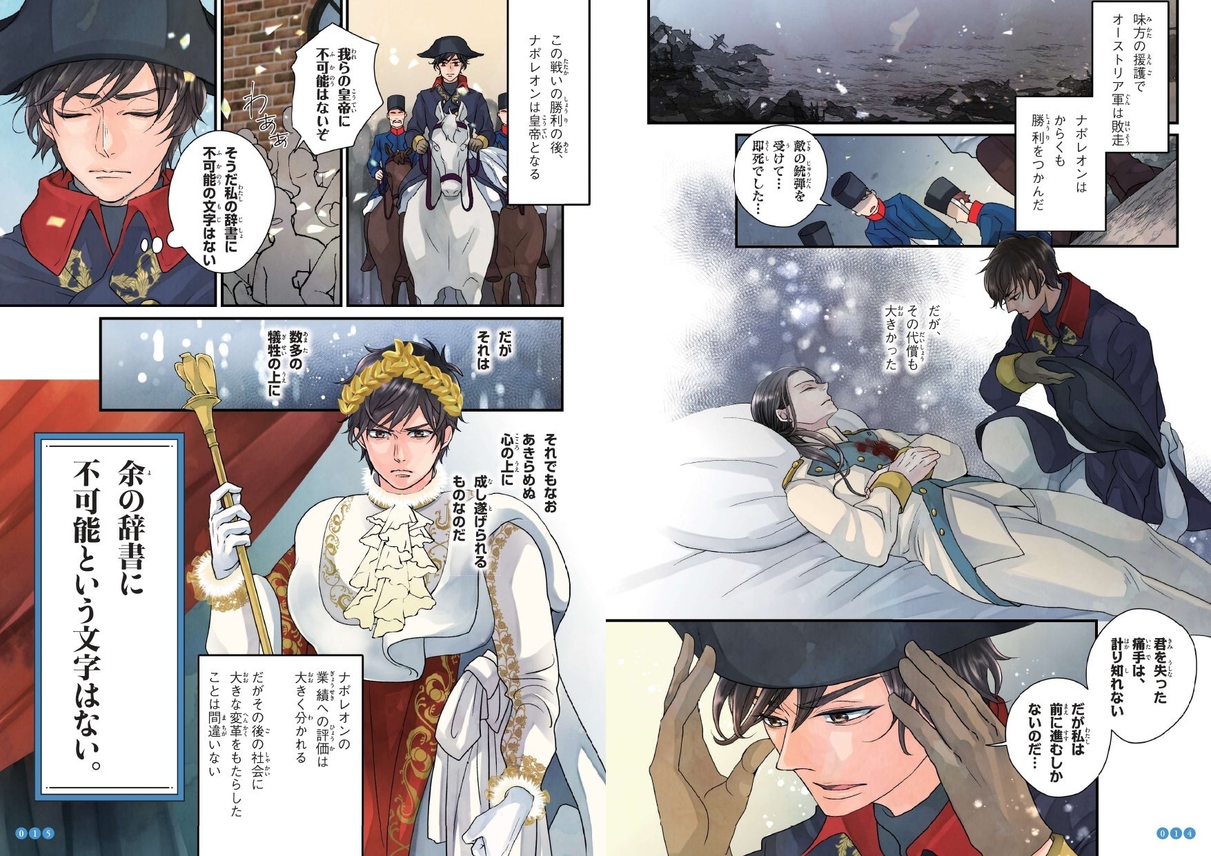 偉人や歴史人物たちの人生を、「ダイジェストあらすじ」的に追うのではなく「名言」を切り口にし、ある場面を劇的なストーリーのオールカラーのマンガにしました。