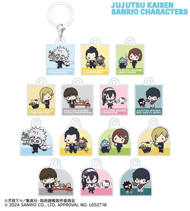 種類 :全10種(五条 悟×シナモロール、夏油 傑×ルロロマニック、家入硝子×ハンギョドン、七海建人×ポムポムプリン、灰原 雄×コロコロクリリン、天内理子×こぎみゅん、伏黒甚爾×バッドばつ丸、五条 悟×シナモロール・夏油 傑×ルロロマニック、五条 悟×シナモロール・夏油 傑×ルロロマニック・家入硝子×ハンギョドン、七海建人×ポムポムプリン・灰原 雄×コロコロクリリン)
