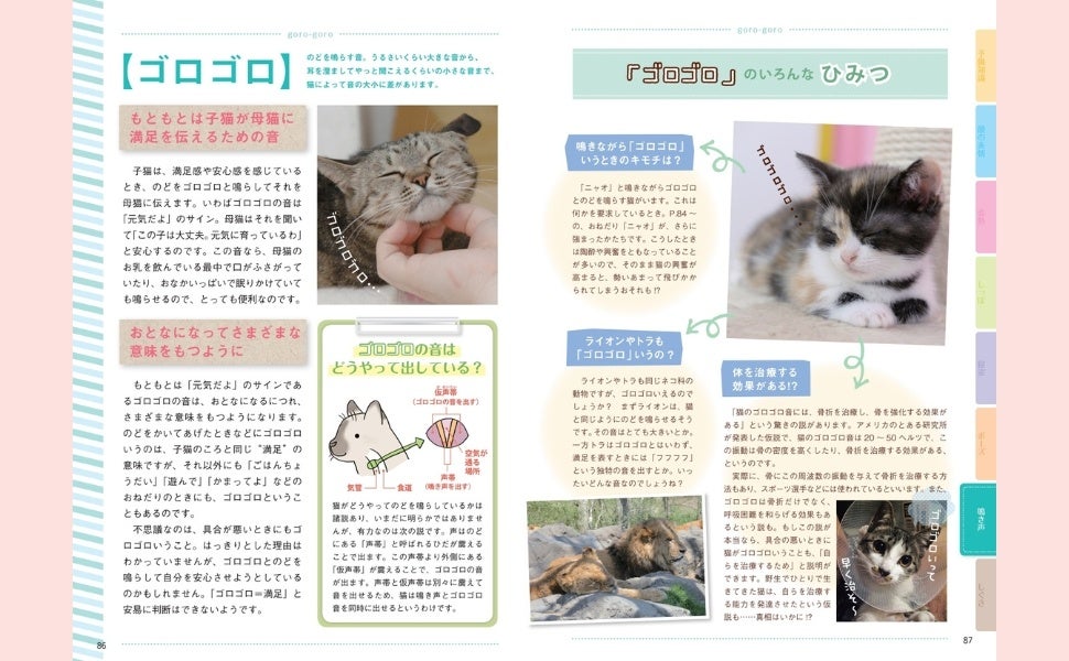 「ニャオ」「ゴロゴロ」「シャー!」鳴き声のシーンも、箱入り寝、マクラ寝、寝姿も、写真と解説を合わせて紹介。