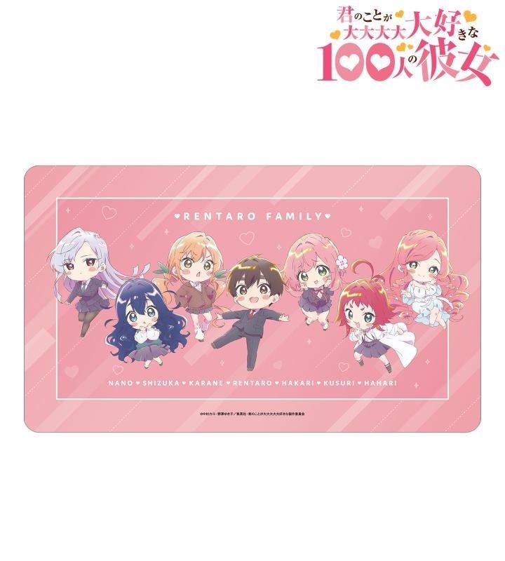 愛城恋太郎、花園羽香里、院田唐音、好本 静、栄逢凪乃、薬膳楠莉、花園羽々里のちびキャライラストをメインに、ハートを散りばめた可愛らしさのあるデザインのマルチデスクマットに仕上げました。