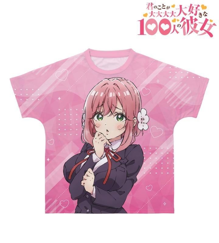 花園羽香里、院田唐音、好本 静、栄逢凪乃、薬膳楠莉、花園羽々里のイラストをメインに、ハートを散りばめた可愛らしさのあるデザインのフルグラフィックTシャツに仕上げました。