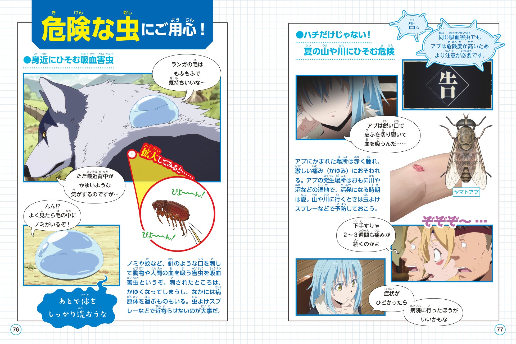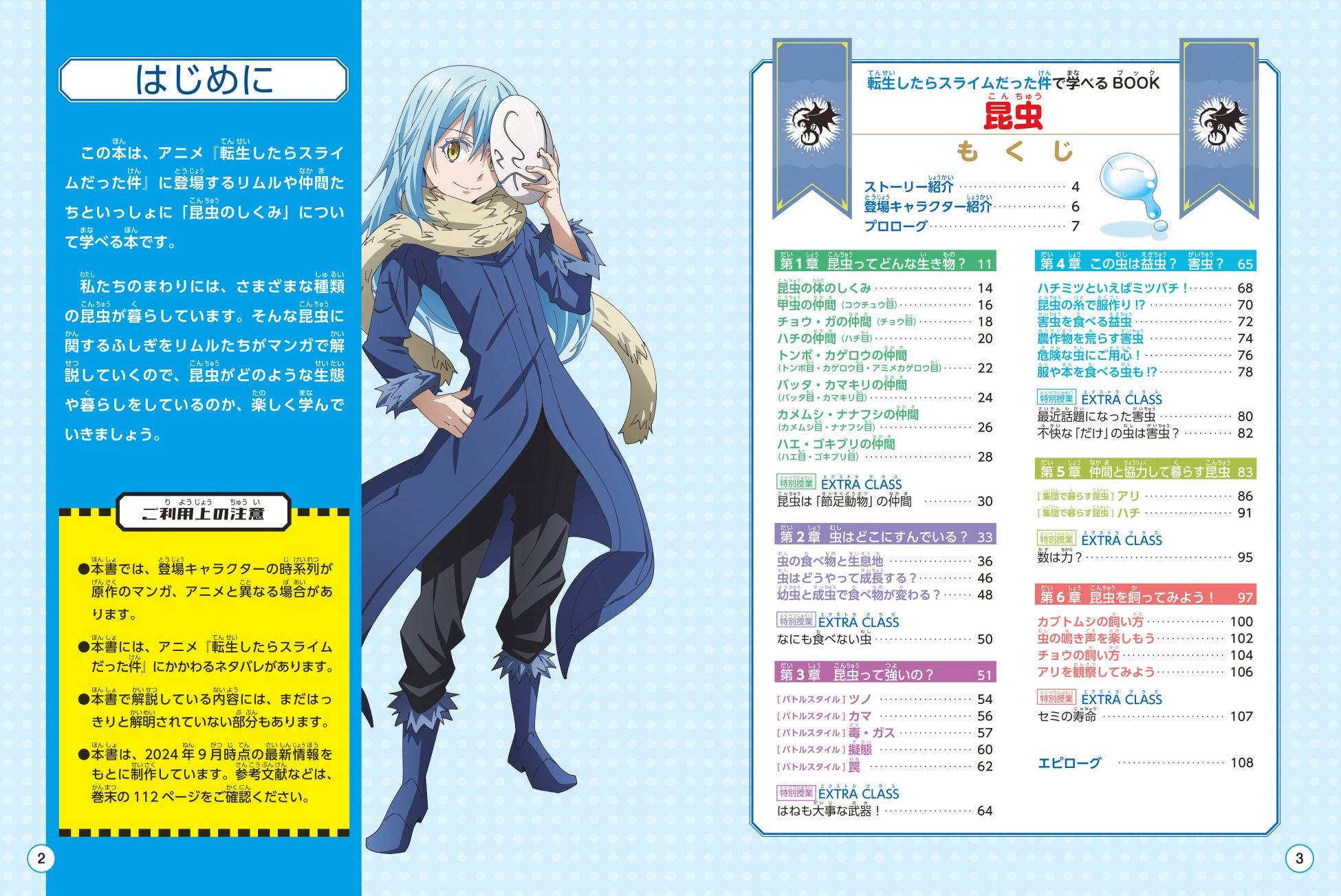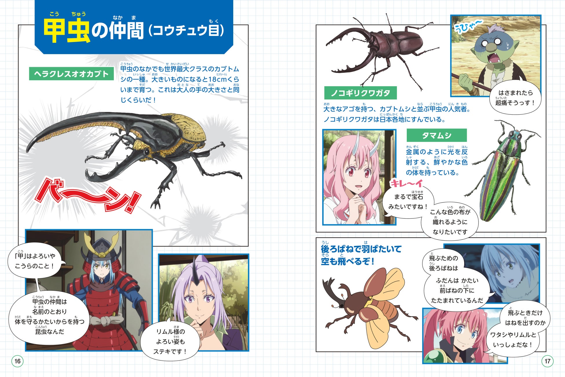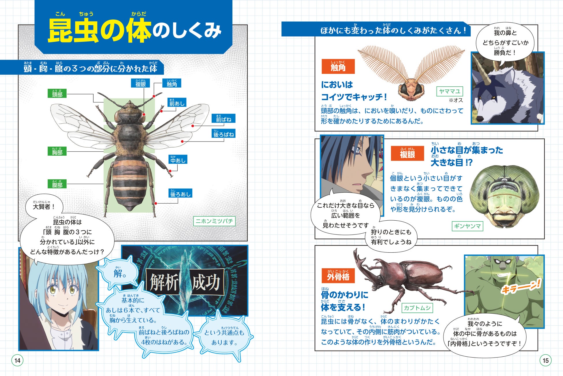 『転生したらスライムだった件で学べるBOOK 昆虫』は小学生向けに分かりやすく解説するため、全編がアニメイラストと昆虫イラストによる、漫画とコラムで構成されています。