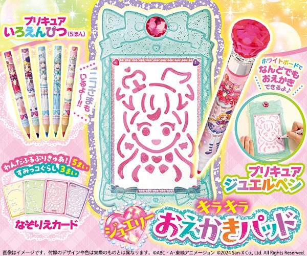 かわいらしいネコ耳型の「おえかきパッド」は、キラキラのジュエリーが付いた豪華仕様! 「プリキュアジュエルペン」にも、おそろいのジュエリーがついています。