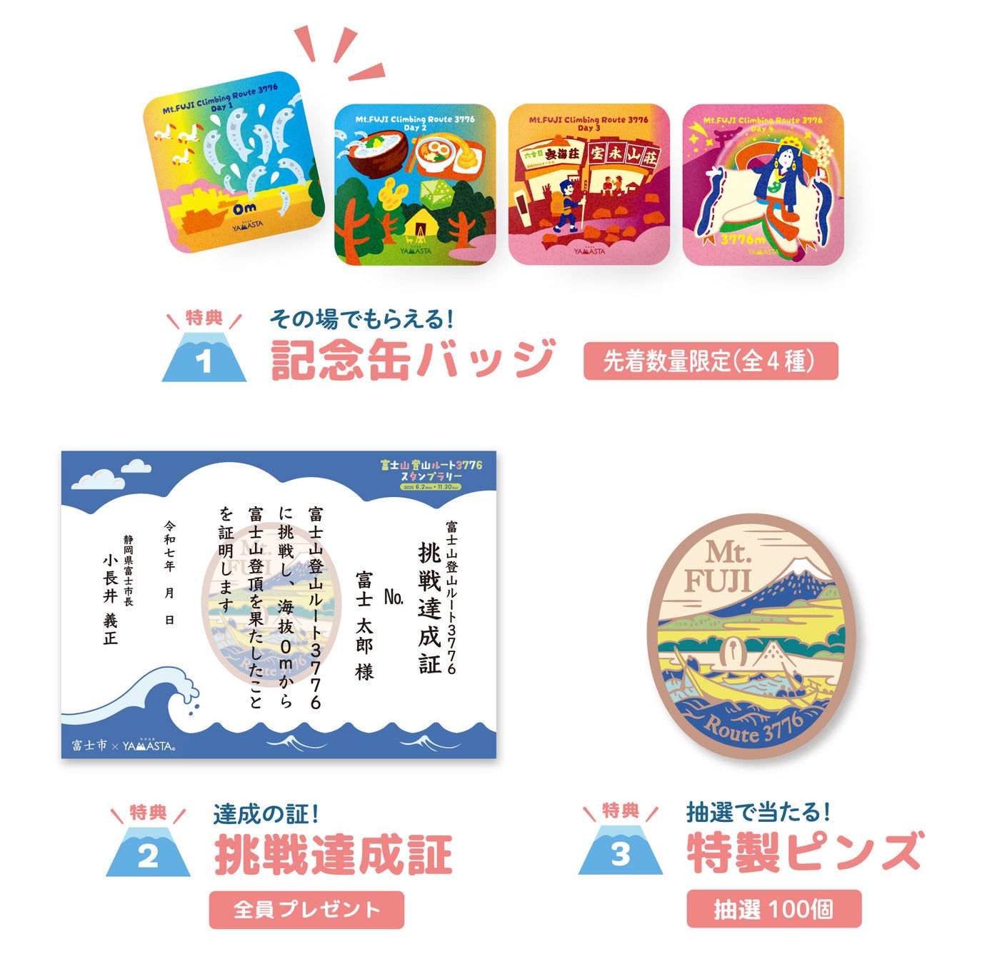 ヤマスタでの「富士山登山ルート3776スタンプラリー」の開催は、今年で2年目となります。「富士山登山ルート3776」のルート上の12か所でデジタルスタンプが獲得でき、その場所の風景や歴史にちなんだデザインが楽しめます。さらに、スタンプを集めると、達成状況に応じて記念缶バッジや挑戦達成証がもらえるほか、抽選で当たる特製ピンズに応募できます。ルート3776に挑戦した記念にぜひGETしてください。