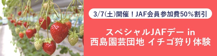 JAF(一般社団法人日本自動車連盟)高知支部(支部長 佐藤 誠三)は、3月7日(土)に西島園芸団地(高知県南国市廿枝600)で開催される「スペシャルJAFデー in 西島園芸団地 イチゴ狩り体験」の参加者を募集しています。※要予約