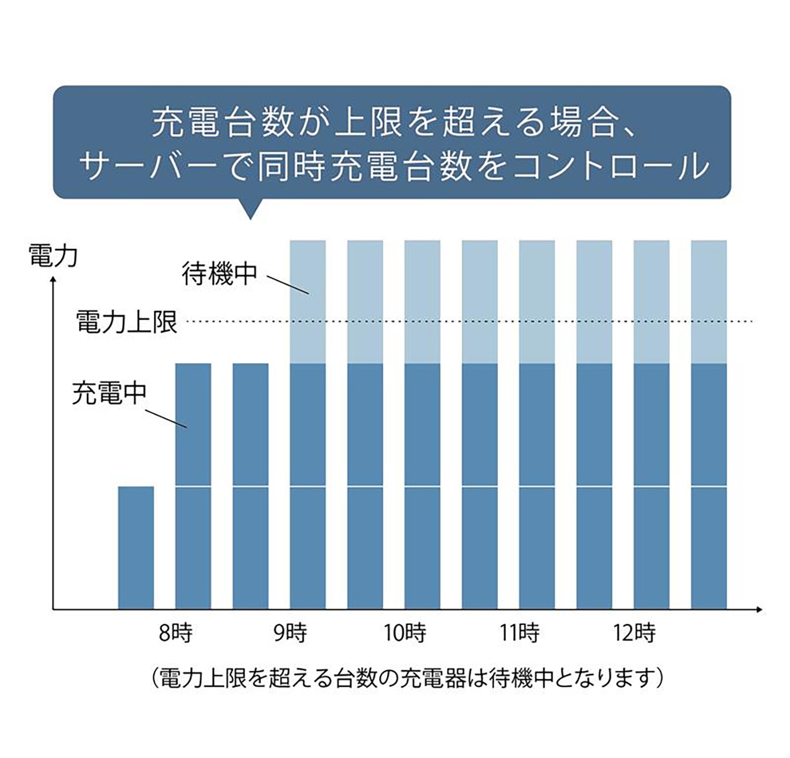 また、共用充電器と専用充電器でそれぞれの利用シーンに合わせた制御を実現しています。共用充電器では、電力上限に応じて同時に予約可能な台数を自動で制限します。専用充電器では、設定した電力上限を超えるタイミングで輪番制御を開始。上限内で全ての車両の充電が進むよう、各充電器を順番に作動させます。