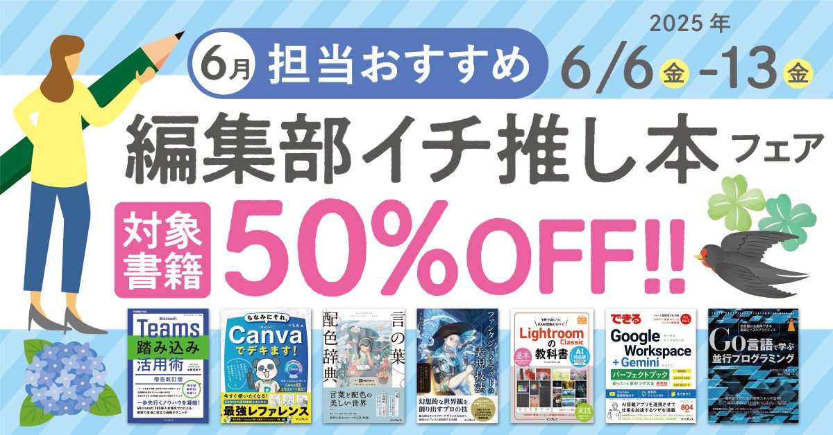 インプレスグループでIT関連メディア事業を展開する株式会社インプレス(本社:東京都千代田区、代表取締役社長:高橋隆志)は、対象の電子書籍が50%オフで購入できる「担当おすすめ!編集部イチ推し本フェア 2025年6月」を2025年6月6日(金)から6月13日(金)まで実施いたします。