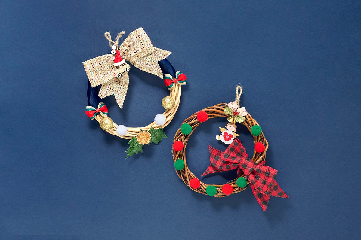これからのクリスマスの時期にぴったり♪ 白系リースとおちついた茶色のリースをセレクトして、そこに自分で好きなデコパーツを組み合わせて、オリジナルのリースを作れます。