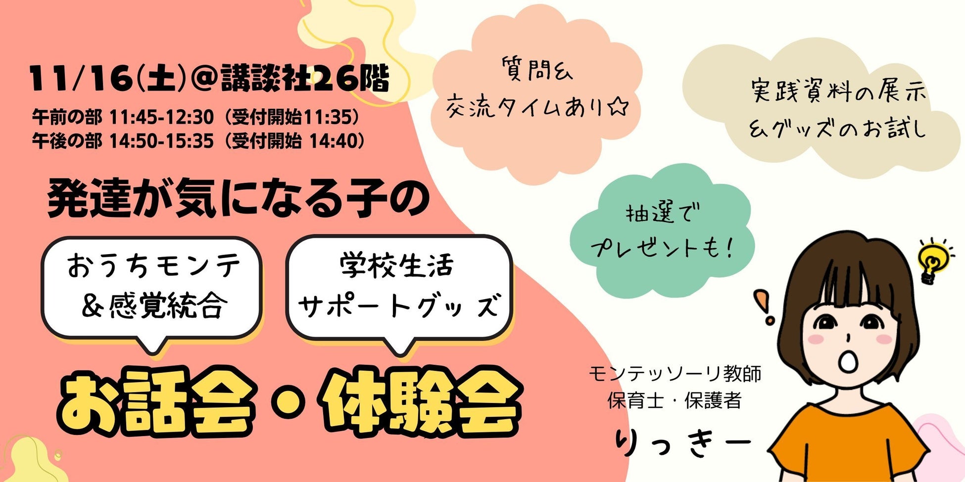 モンテッソーリ講師のりっきーさんによる、発達が気になる子を土台から伸ばす感覚統合とおうちモンテの少人数制のお話会!セミナーの後半には書籍でご紹介したサポートグッズやモンテッソーリの教材のお試しタイムや交流タイムもあるので、ぜひ一緒にお話しましょう♪