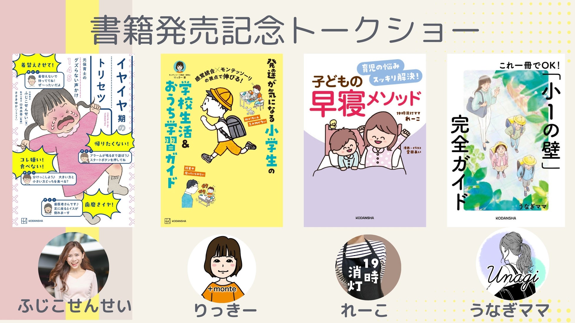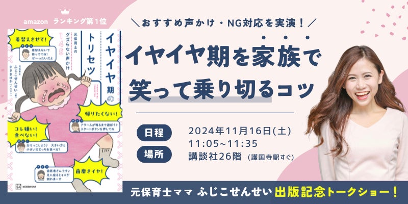元保育士でイヤイヤ期専門ヲタクのふじこせんせいによる、イヤイヤ期を乗り切るためのQ&Aトークショー!著書『元保育士のグズらない声かけ145 イヤイヤ期のトリセツ』(講談社)を記念して、イヤイヤ期で困ったときの声かけを実践披露してくれます♪