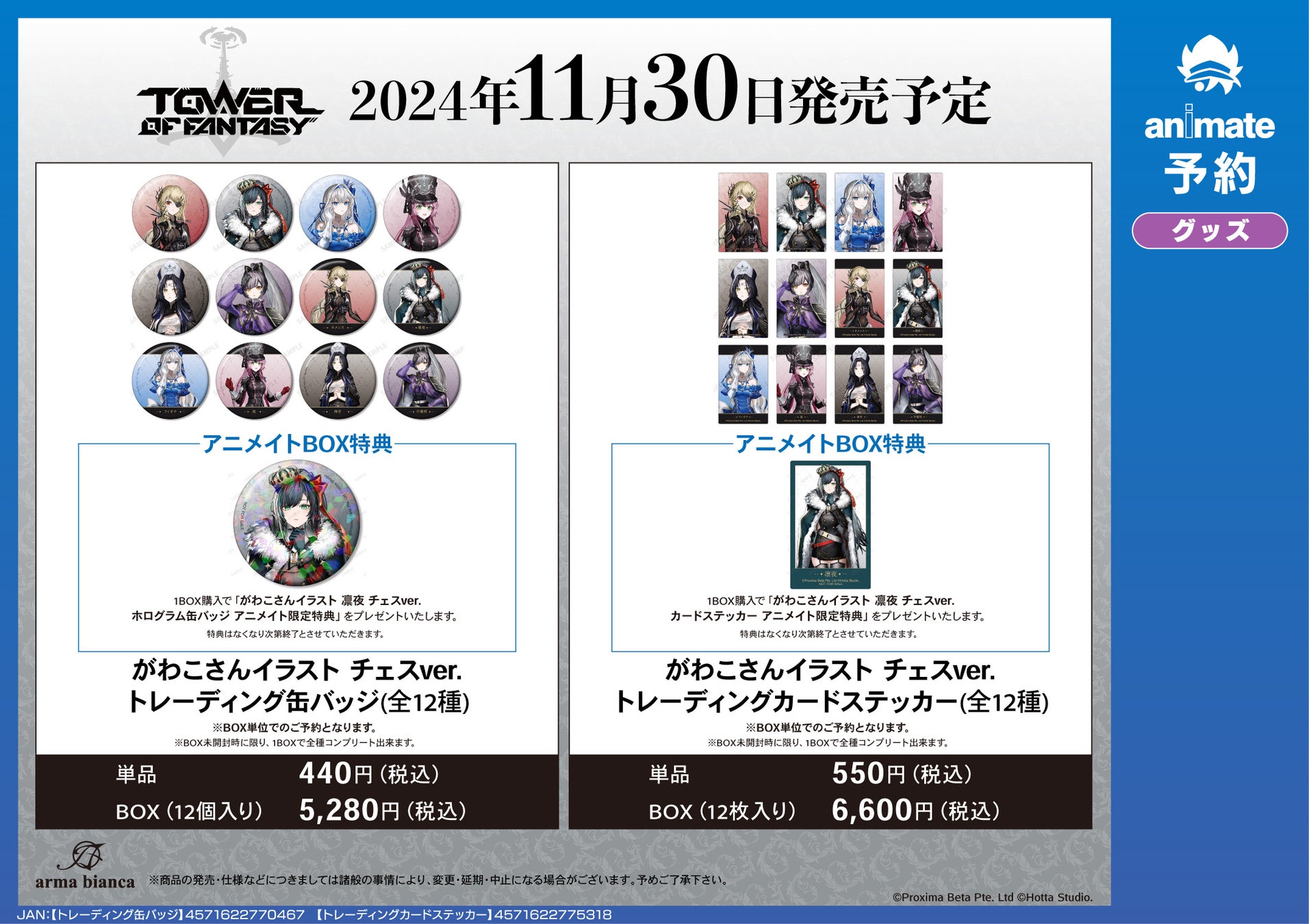 ※11月30日(土)より予約開始予定のECサイト「AMNIBUS」「ARMA BIANCA」では、BOX購入特典として「がわこさんイラスト 不破咲 チェスver. ホログラム缶バッジ AMNIBUS特典」を予定しております。