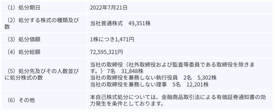 当社は、2022年6月22日開催の取締役会において、下記のとおり、譲渡制限付株式報酬としての自己株式の処分(以下「本自己株式処分」又は「処分」といいます。)を行うことについて決議いたしましたので、お知らせいたします。