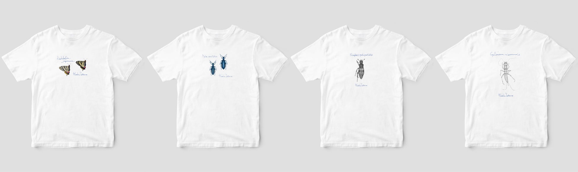 絵本作家である舘野鴻の作品のTシャツが登場いたしました。ラインナップは、『ぎふちょう』、『つちはんみょう』、『しでむし』、『がろあむし』の4種類です。それぞれの標本画と、舘野鴻のサインが入っているのがポイント。標本画だからこそ感じられる虫の細かい部分の再現性が高く、虫好きな方にもおすすめです。