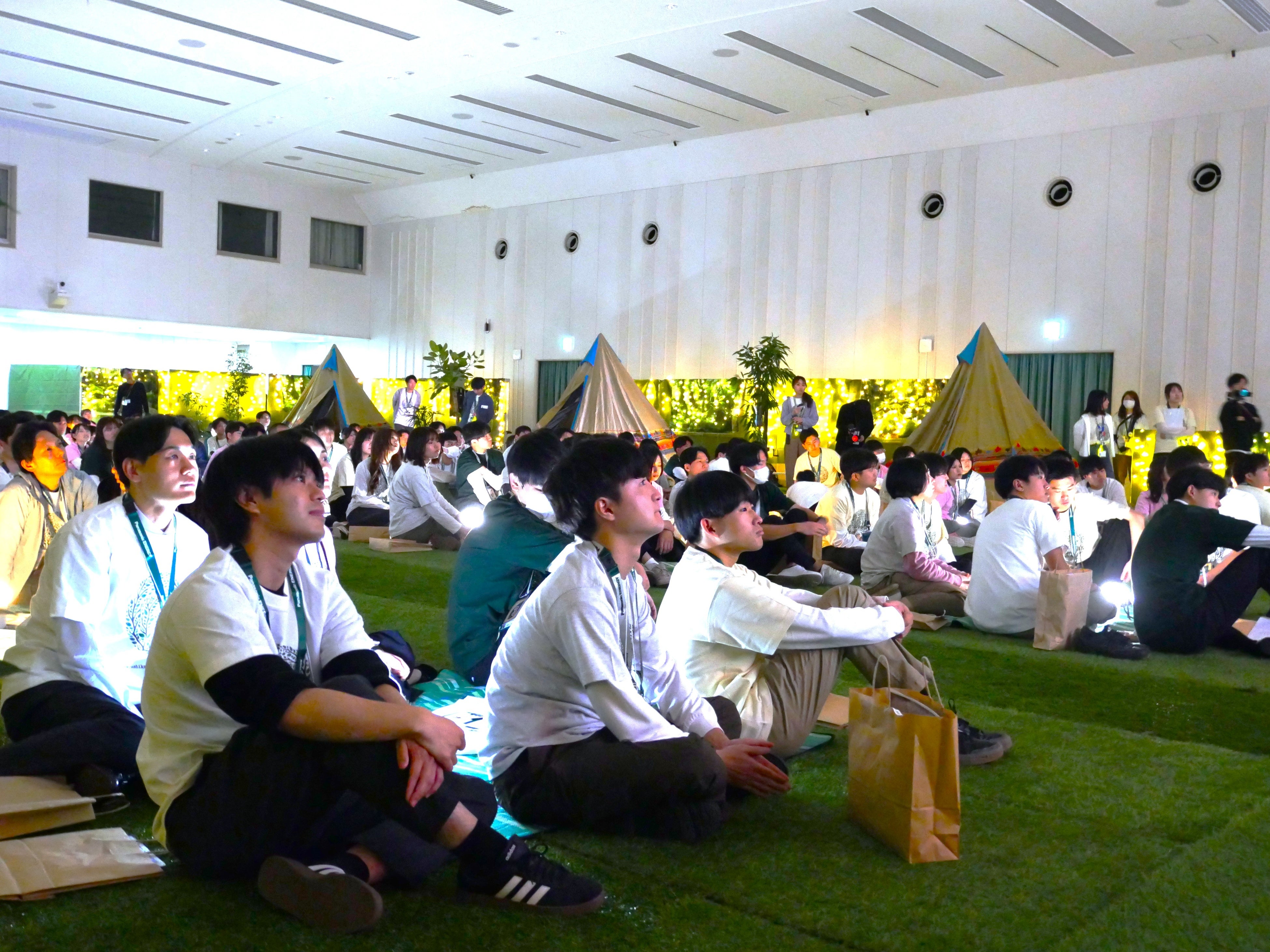 2026年度のウェルカムセレモニーは、“My Energyとの出会い”をコンセプトにしています。パナソニック エナジーは、社員一人ひとりの仕事における夢や原動力を“My Energy”と定義しており、今回は社会人生活のスタートとなる節目の日に、その発見につながるきっかけづくりを目的としています。パナソニック エナジーは、「幸せの追求と持続可能な環境が矛盾なく調和した社会の実現」をミッションに掲げ、電池を中心としたエナジー事業を通じて社会課題の解決に取り組んでおり、その「調和」のシンボルを「森」に見立て、森林や里山の中でキャンプをしながらパナソニック エナジーのミッションが目指す未来像を役員と社員が共に議論する「森の会議」を実施しています。今回は、その「森の会議」に参加しているようなキャンプ場をイメージしたレイアウトで、会場内に人工芝生を床一面に敷き、テントやキャンプ椅子などを設置しました。また、新入社員や役員もキャンプをイメージしたカジュアルな服装で参加しました。この入社式は、公募で集まった入社1~2年目の若手社員が、半年間のプロジェクトで企画・運営したパナソニック エナジー初の試みです。過去に出席した入社式の経験をもとに、新入社員の目線に立ち、一から企画立案を行った点も本取り組みの特長です。