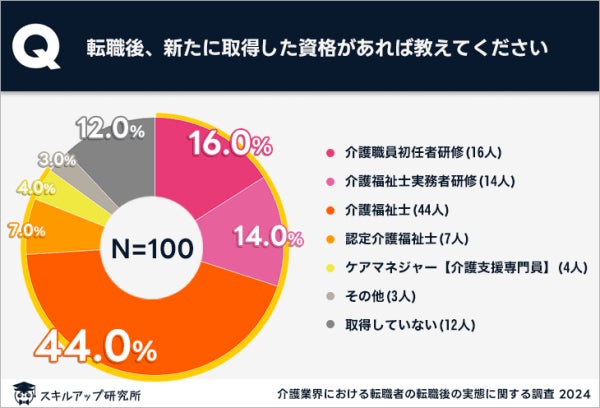 「転職後、新たに取得した資格があれば教えてください」という質問に対し、44%が「介護福祉士」と回答した。