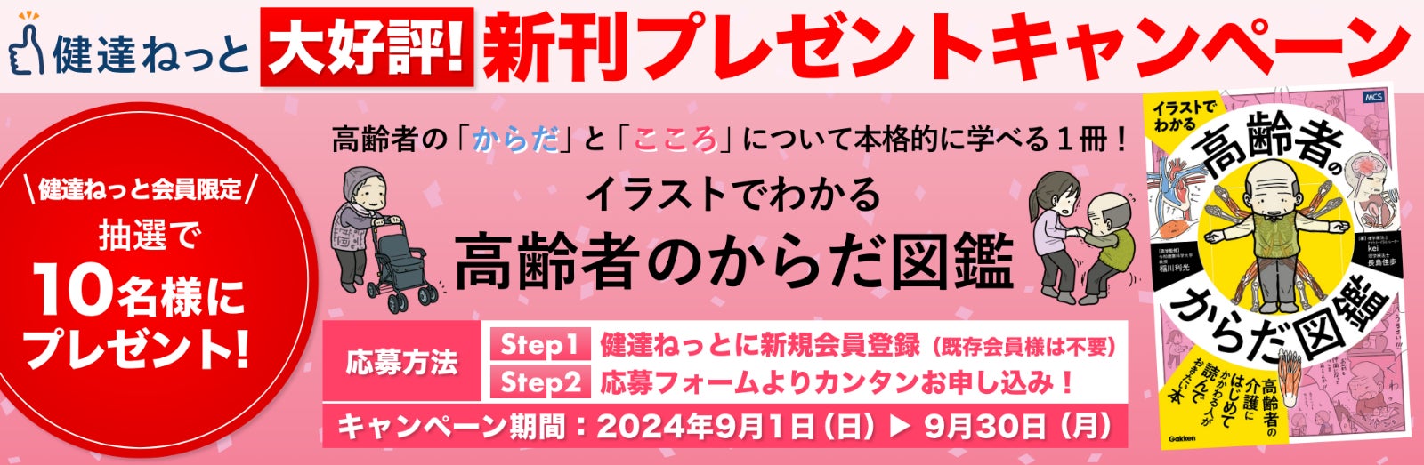 株式会社 学研ホールディングス(東京・品川/代表取締役社長:宮原博昭)のグループ会社、メディカル・ケア・サービス株式会社(埼玉・さいたま市/代表取締役社長:山本教雄)は、家族の介護と健康を支える学研の情報サイト「健達ねっと」にて2024年9月1日(日)より、「書籍プレゼントキャンペーン第3弾」を開始いたしました。