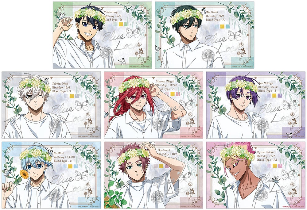 そして、全国アニメイト(通販除く)にて8月16日~9月7日まで開催するフェア第2弾では、期間中、『ブルーロック』関連のグッズをご購入・ご予約内金1,100円(税込)毎、または書籍・CD・Blu-ray・DVDをご購入・ご予約(内金1,100円〈税込〉以上必須)1点毎に、特典「箔押しイラストカード(全8種)」を1枚プレゼントいたします。特典は第1弾、第2弾ともに、花冠をつけた潔や凛たち8人の描きおろしイラストを使用しています。