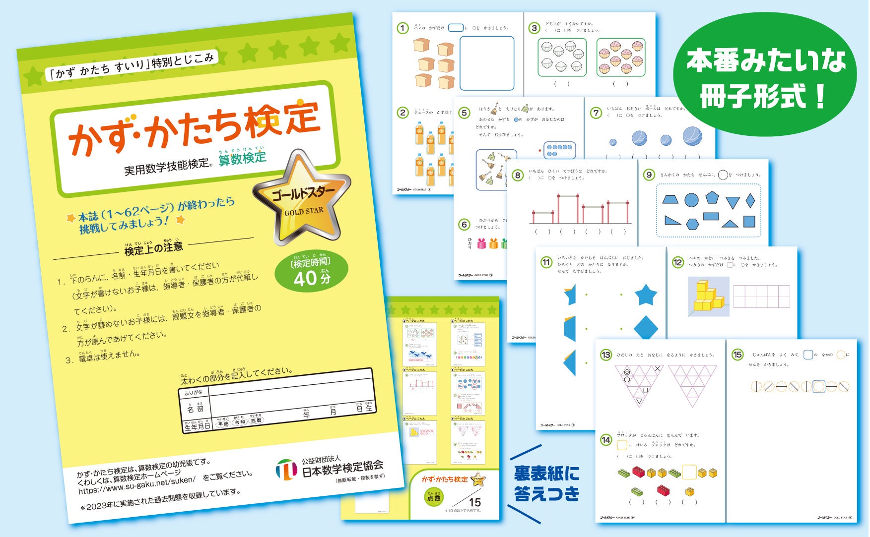 2023年度実施の「かず・かたち検定 ゴールドスター」の過去問題つき。冊子形式なので、検定本番を想定した予行練習ができます!