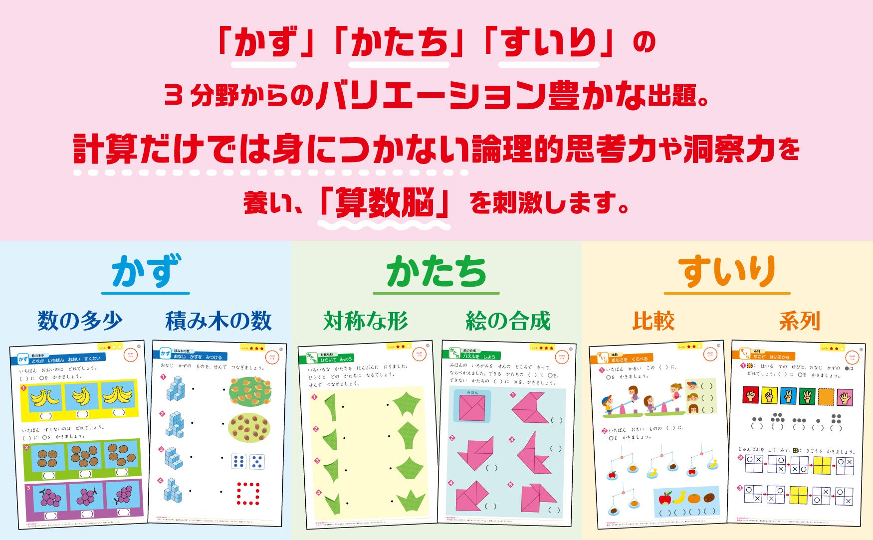 【日本数学検定協会 協力】幼児期に学んでおきたい「かず」「かたち」「すいり」の3ジャンルの問題で「算数脳」を育てる! 幼児向けさんすうワークの新装版が発売
