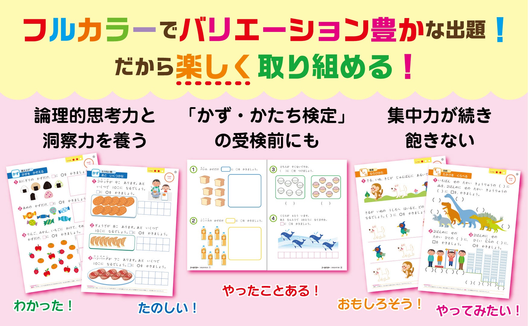 本誌には「かず・かたち検定」の問題に類似した問題が多数収録されており、過去問題の冊子もついているので、検定前に取り組むのにもぴったりです。
