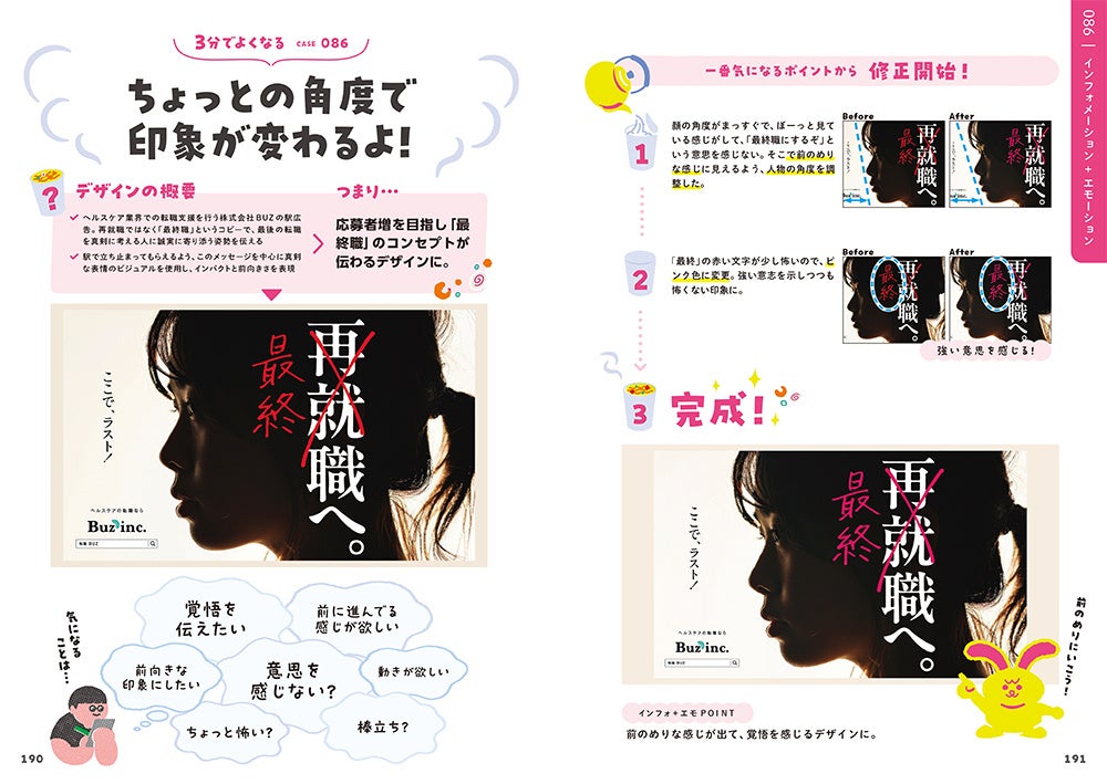 まだ完成していないデザインは「なんとなく違和感がある」状態になりがちです。ですが、「何が足りないか?」を正確に見抜き、的確に補うためには、デザイナーとディレクターの双方が意見を出しあう“共同作業”が必要不可欠。コミュニケーションを重ねるほど質が高まり、デザインはより洗練されていきます。ぜひ本書を通じて、デザインがどのように磨き上げられていくかを体感してください。