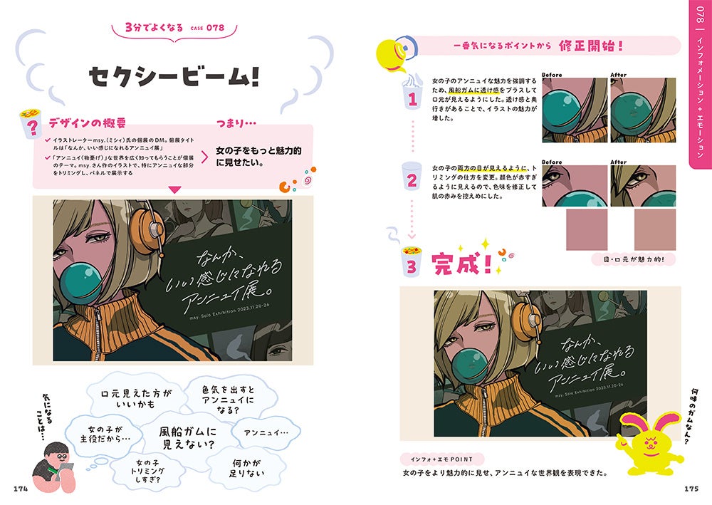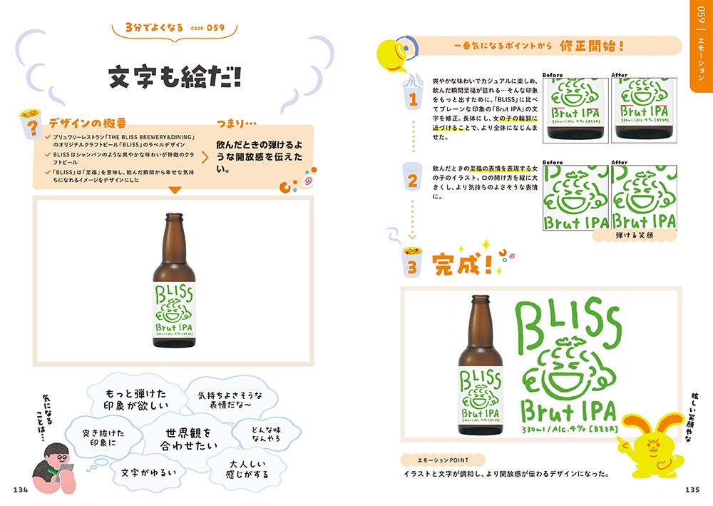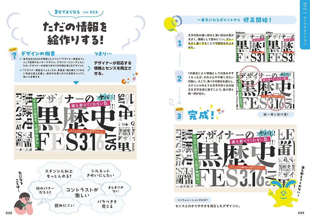 デザイナーならではの膨大な修正の理不尽さを解決するヒントも本書にあります。その鍵は「情報(information)」と「情緒(emotion)」のバランスです。グラフィックデザインの本質は「伝える」ことであり、単に「美しく」するのではなく、「誰に何を、どんな感覚で伝えたいのか」を考えることが重要です。情報に重きを置けば視認性や論理的理解が高まり、一方で情緒を強化すれば独特の魅力や印象が増す――どちらに比重を置くかはケースバイケースで異なります。デザイナー、ディレクター、クライアントがこの視点を共有し、毎回チューニングを重ねることで「どっちやねん!」という混乱は大幅に減り、デザインの質が確実に向上するでしょう。