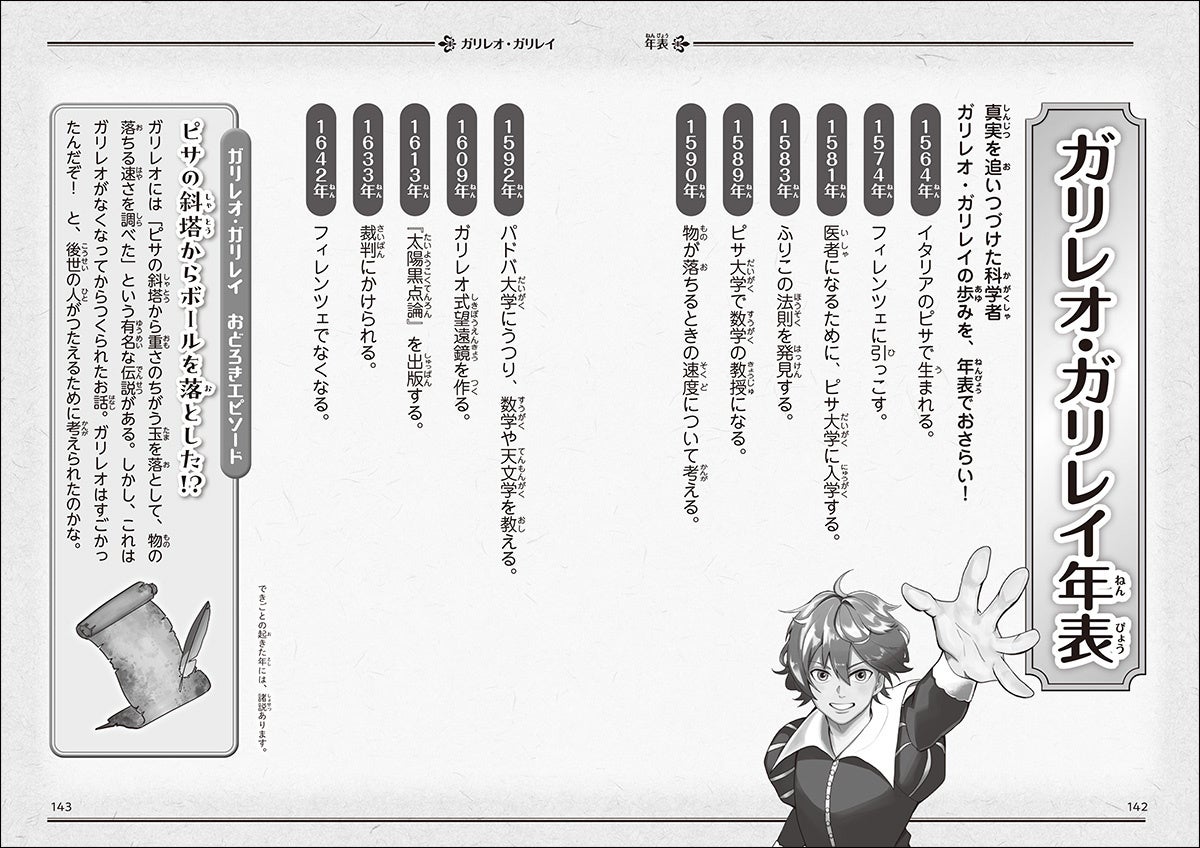 人生の歩みをおさらいできる「年表」つき。じつは、ピサの斜塔からボールを落とす実験は行っていない!? ガリレオにもっと興味がわくエピソードも掲載しています。