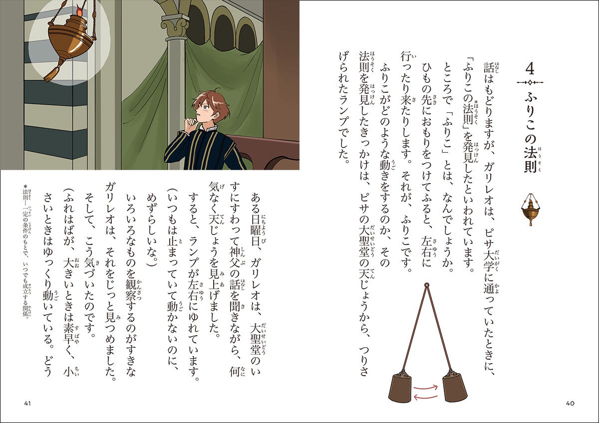 巻頭に図解ページを収録。ガリレオや、お話に登場する人物の紹介、ガリレオが活躍したイタリアの都市や、子ども時代から晩年までの流れがひとめでわかります。ガリレオの人物や人生のイメージがわくので、お話に入りこみやすくなります。