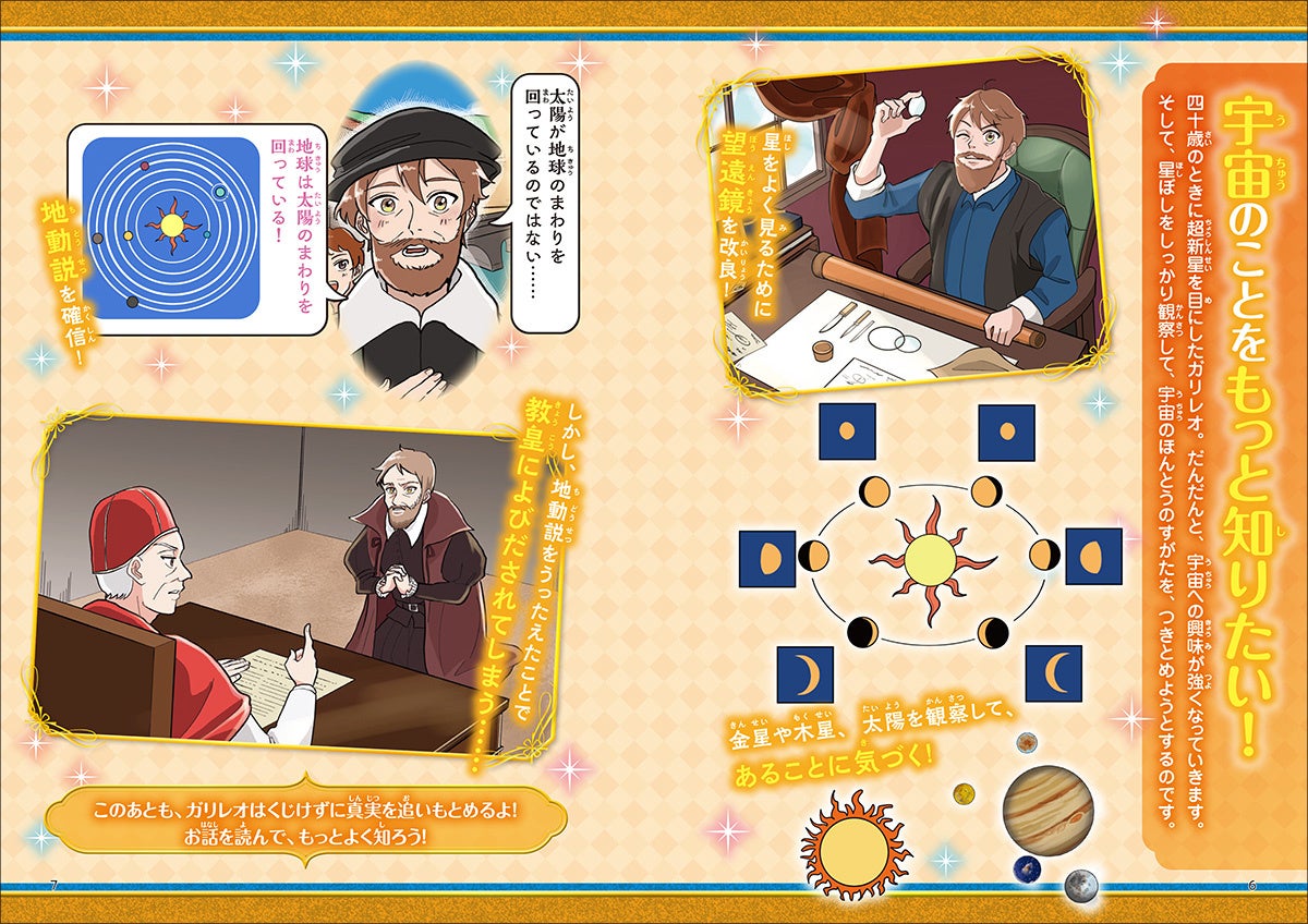 たくさんのカラーイラストを掲載。ガリレオについて、彼が生きた時代や行った実験や観察について、わかりやすい文章とイラストの両方で、理解を深める手助けをします。