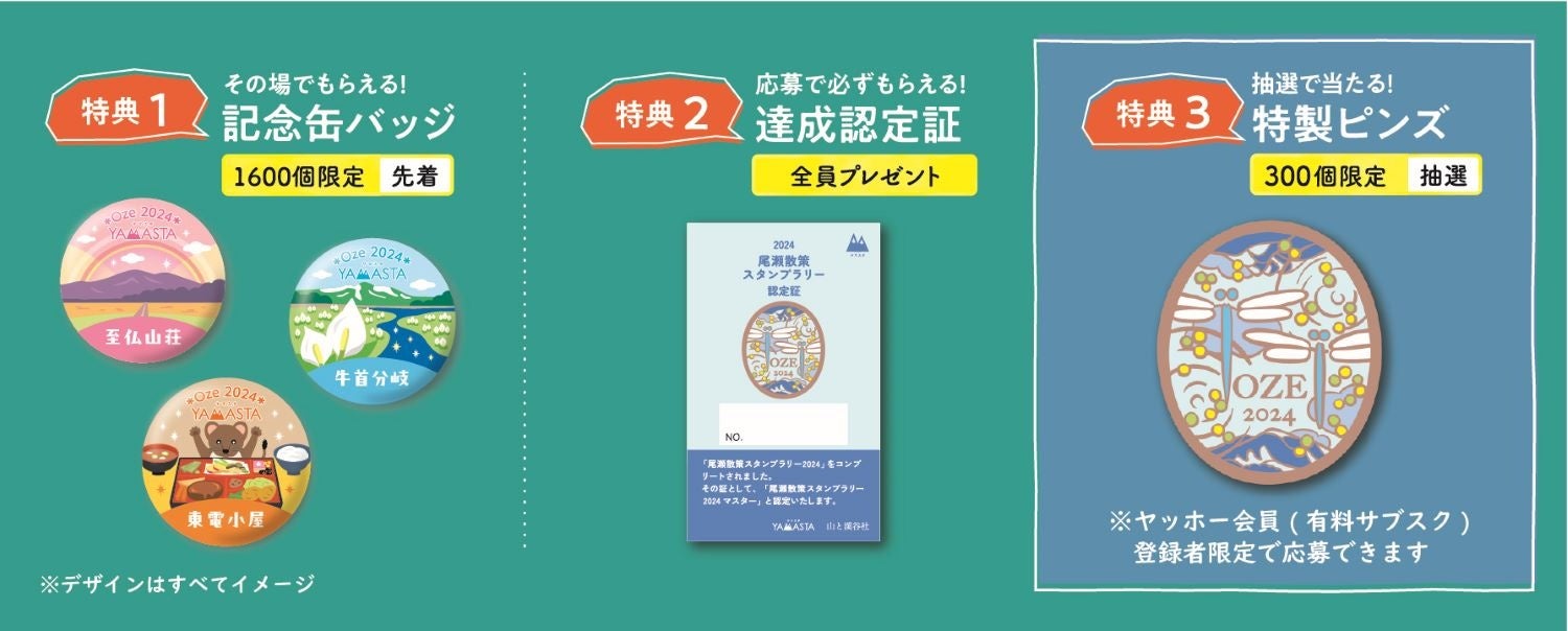 スタンプを集めていくと「記念缶バッジ(先着数量限定)」や「達成認定証」がもらえます。さらに、ヤマスタの有料サブスクリプション「ヤッホー会員」にご登録いただいている方には、人気の「特製ピンズ(抽選)」にご応募いただけます。スタンプラリー参加の記念に、尾瀬散策の思い出とともにお持ち帰りください。
