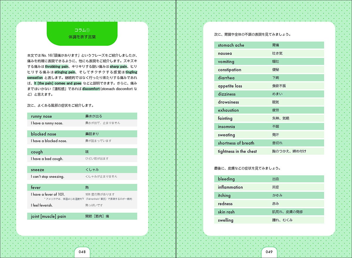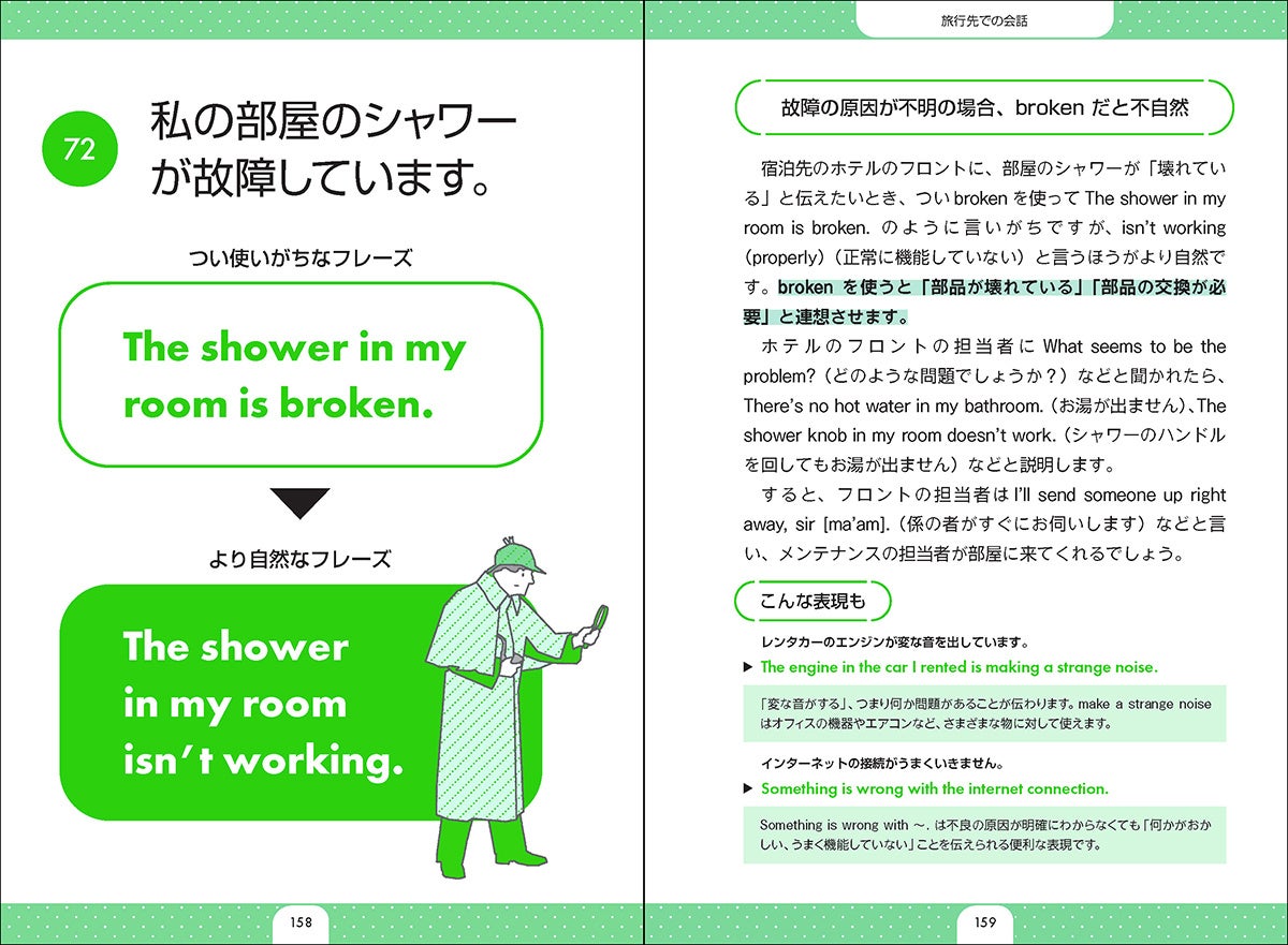 日常生活で使えるフレーズを中心に、旅行先やビジネスで使えるフレーズも厳選して収録。ホテルの客室のシャワーが壊れていたら、フロントに何と言う? 仕事のアポイントメントをとるときに、忙しい相手への気配りが伝わる聞き方は? よくあるシチュエーションで役立つフレーズが学べます。