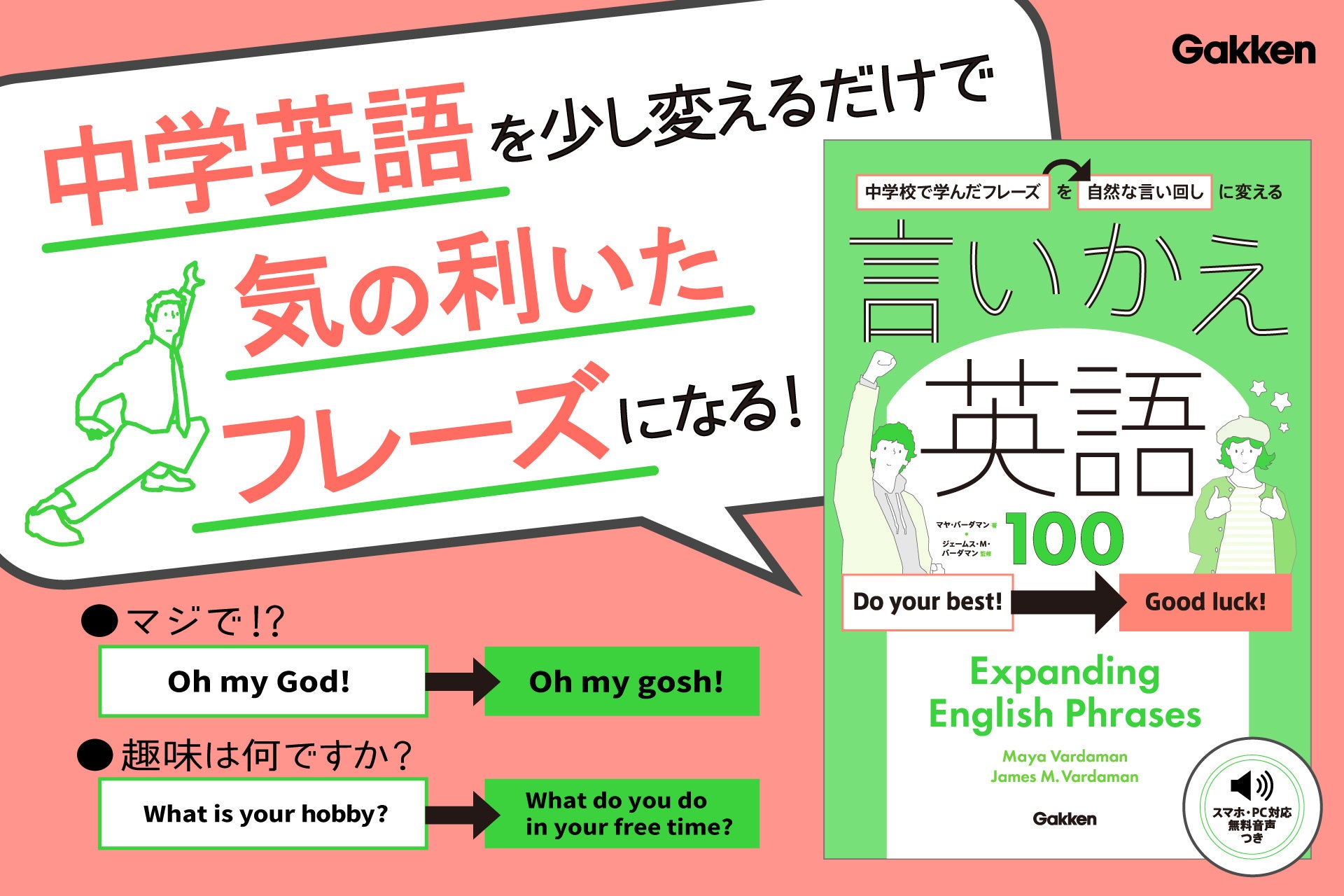 中学校で学んだフレーズの「言いかえ」を100パターン掲載! 中学英語を土台に、より自然な表現力を身につけるための語学書が登場。執筆はマヤ・バーダマン、監修はジェームス・M・バーダマン。