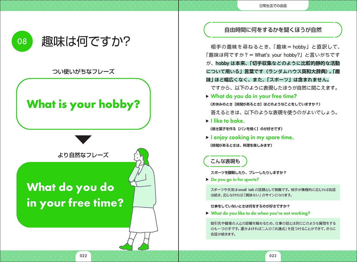 相手の趣味を聞きたいとき、「趣味=hobby」と直訳して、「What is your hobby?」と言うこともできますが、実は「What do you do in your free time?」と言うほうが自然です。いったいなぜ? このように本書では、つい使いがちなフレーズをより自然なフレーズに言いかえるパターンを100例紹介し、両者のニュアンスの違いをわかりやすく解説しています。