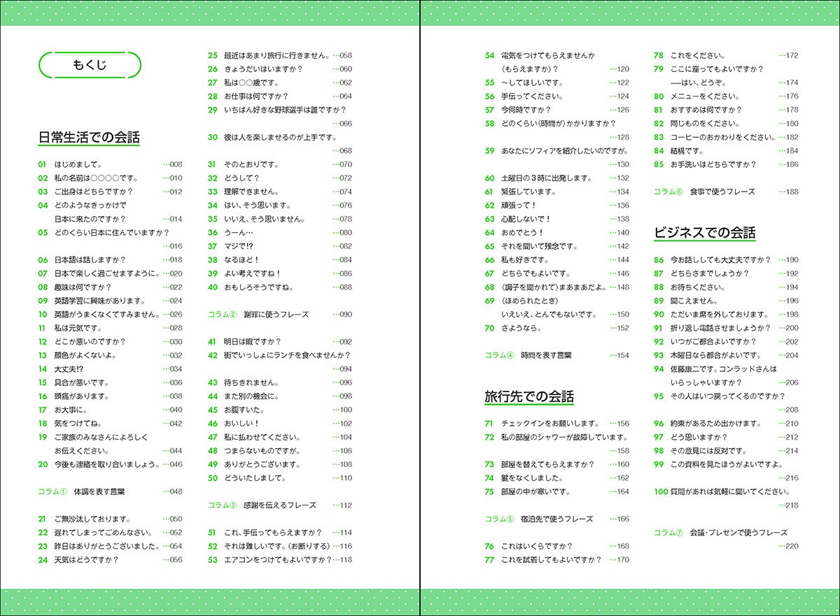代表的な言いかえ表現に加え、相手や場面に応じて使い分けるための表現も掲載しているので、表現の幅が広がります。もっと知りたい方向けに「感謝を伝えるフレーズ」「謝罪に使うフレーズ」「時間を表す言葉」などのコラムも収録しています。