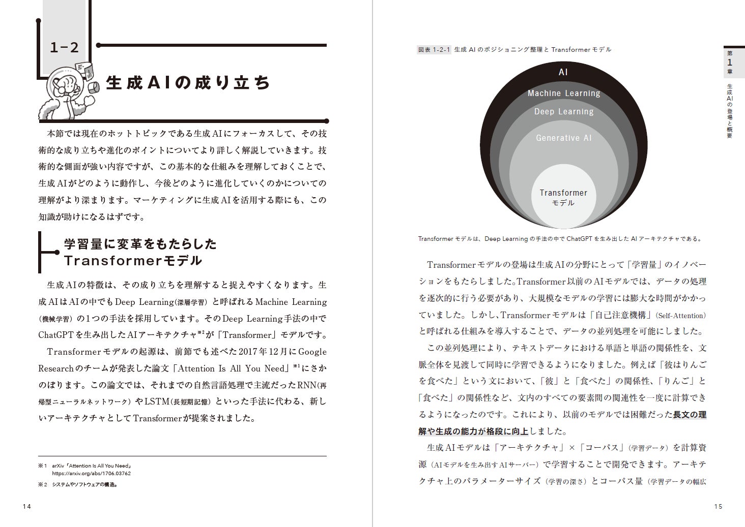 本書はこのような状況を踏まえ、生成AIの基礎から企業での事例、マーケティングへの活用方法、課題とリスク管理、そして未来への展望までを取り上げています。特に、生成AIの技術的な背景を、難しい数式や専門用語を極力使用せず、誰でも理解できるように解説しているのが特徴です。本書を読み進めることで生成AIの「強み」と「弱み」を理解できれば、自身の業務への活用の仕方も見えてきます。