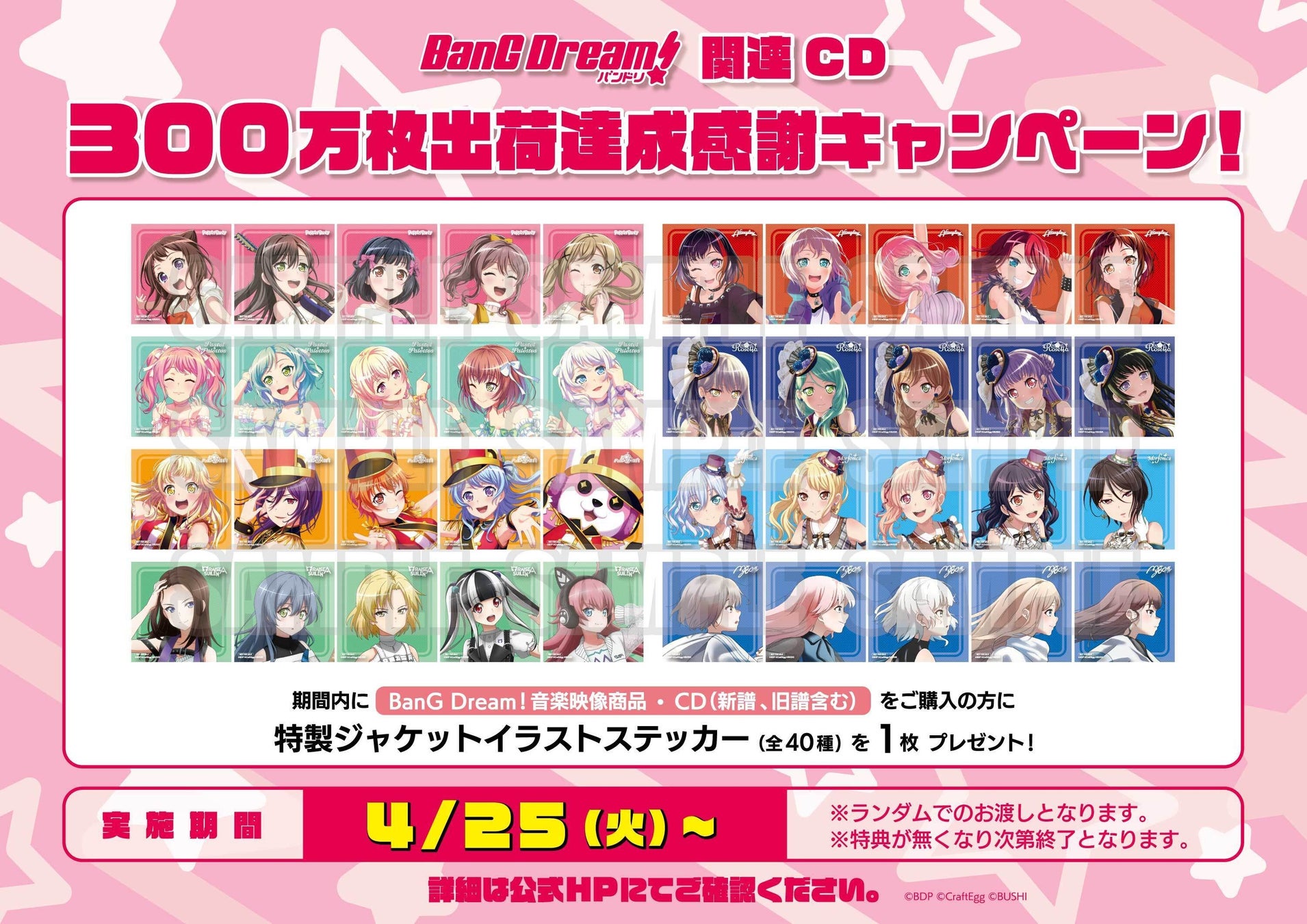 期間内にBanG Dream!(バンドリ!) 音楽映像商品・CD(新譜・旧譜含む)をご購入の方に、ジャケットイラストステッカーをランダムで1枚プレゼントいたします。