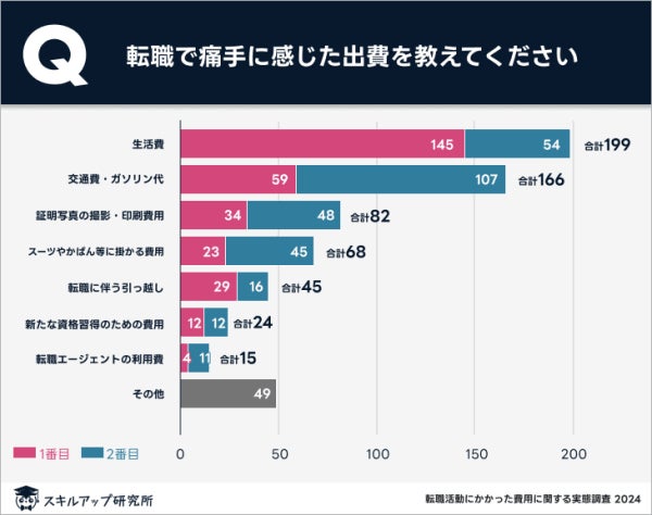 転職で痛手に感じた費用について尋ねてみると、最も多くの回答者が1番かかった費用として挙げたのは「生活費」であった。計199人が2番目までに選択し、回答者のほとんどが主要な支出項目にあげたことが分かる。