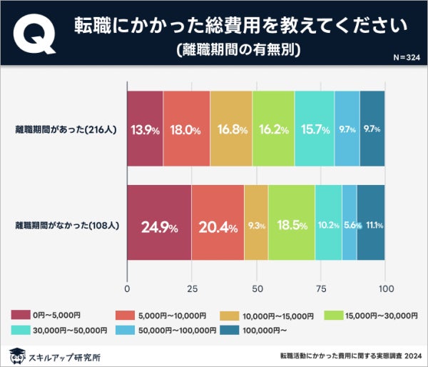 転職期間にかかった総費用について、離職期間があった人と離職期間がなかった人の回答を比較すると異なる傾向が見られた。