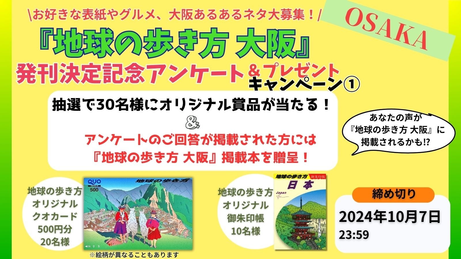 『地球の歩き方 大阪』の表紙を飾るイラスト、おすすめグルメやスポット、ご当地あるあるや大阪府の自慢など、大阪府民の方、大阪府出身の方や大阪に旅行経験のある方の“大阪愛”あふれる声を大募集しています。お寄せいただいた貴重なご意見や体験談が『地球の歩き方 大阪』に掲載された場合、掲載本を贈呈。また、アンケートにお答えいただいた方のなかから抽選で30名様に、地球の歩き方オリジナルクオカードなどのプレゼントが当たります。(締切:2024年10月7日)