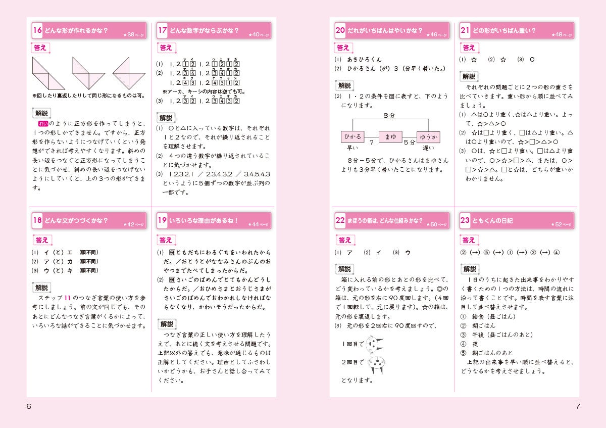 本書の解答には得点欄を設けていません。単に「正解」や「不正解」を示すのではなく、お子さまが「なぜそのように考えたのか」を重視することが、論理的思考力を育む第一歩です。おうちの方向けの丁寧な解説を参考にして、お子さまと一緒に考え方を話し合ってみてください。悩んだあとに考え方を理解し、「そうだったんだ!」と感動する瞬間が、学びへのモチベーションを高める手助けとなります。