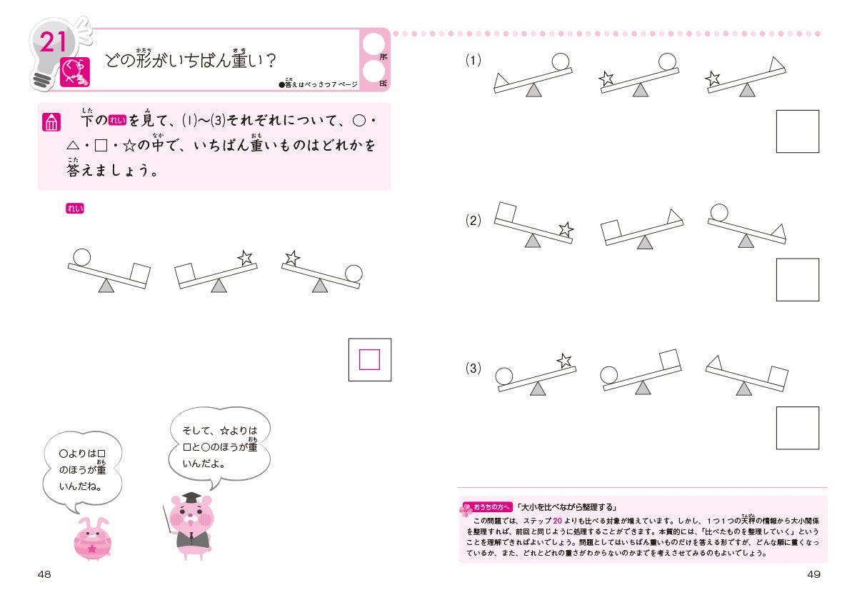 1見開きで完結するシンプルな問題配列なので、1日15分ほどでサクッと取り組めます。旧版では、「なぞなぞを解く感覚で、楽しみながら学習を進められる!」とご好評をいただいておりました。イラストを見て解く問題、文章を読んで考える問題、パズルのような試行錯誤が必要な問題など、さまざまな形式がそろっています。