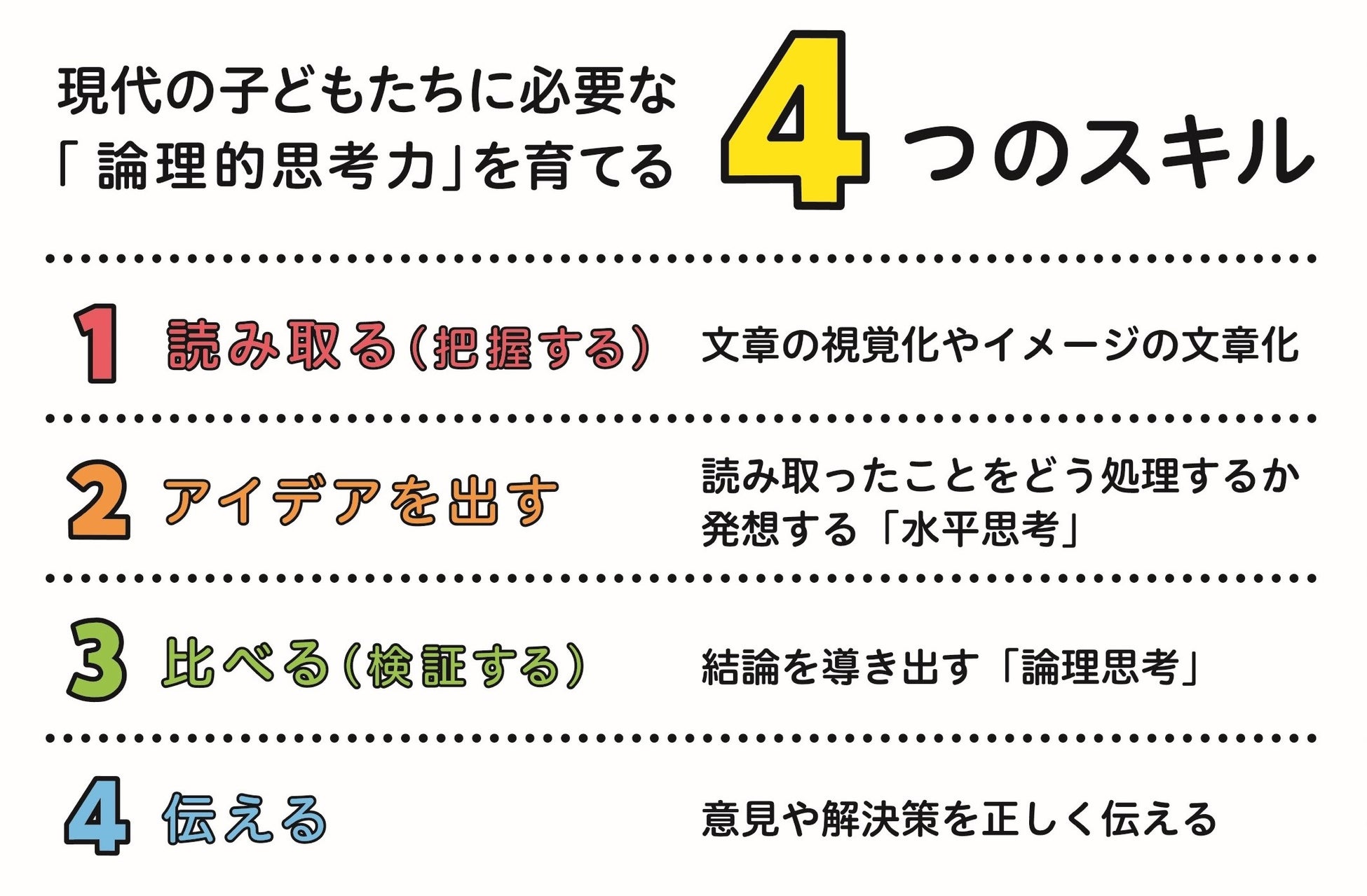本書は、論理的思考力を育てる4つのスキルを身につけられるキッズワークです。