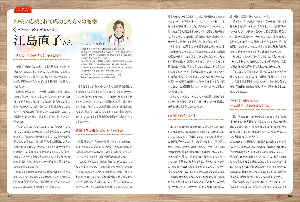 困ったときや悩んだときにパワースポットへ行くと、気分がすっきりしたり、悩みが解消されたり、不思議と困りごとの解決の糸口が見えてきます。本書では、そんな「訪れるだけで心が整う場所」「写真を眺めるだけでも気分が変わる場所」を、私の実体験と共にお届けしています。もし今、ちょっと疲れていたり、次の一歩に迷っていたりする方がいたら、本書がそっと背中を押すような存在になれたらうれしいです。