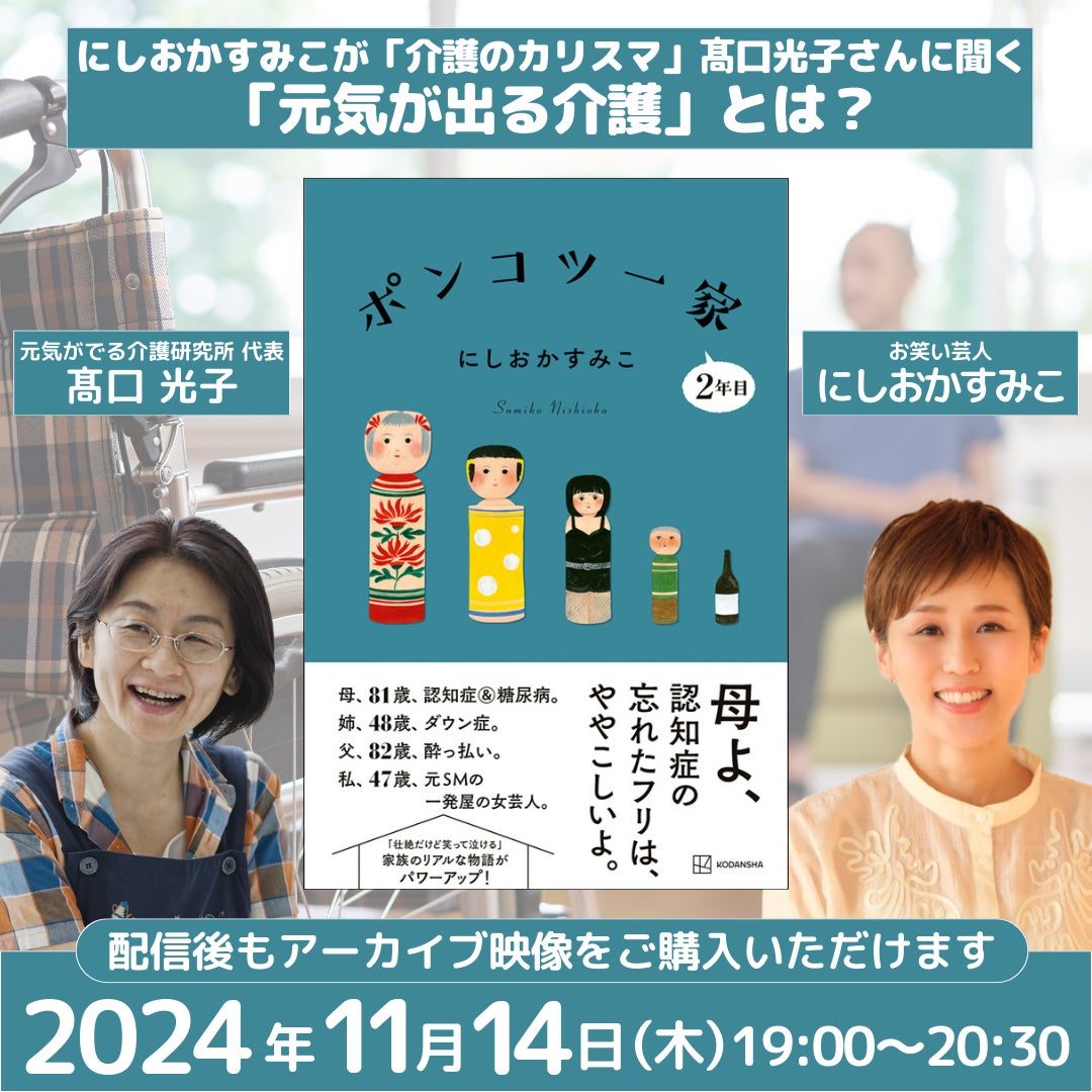 「認知症の母、ダウン症の姉、酔っ払いの父と暮らすにしおかすみこが「介護のカリスマ」高口光子さんに聞く「元気が出る介護」とは」と題し、どんどん質問しまくります。そしてお客様からのQ&Aも…!リアルで来られない方には、2週間視聴できるアーカイブのあるオンライン参加券もあります。