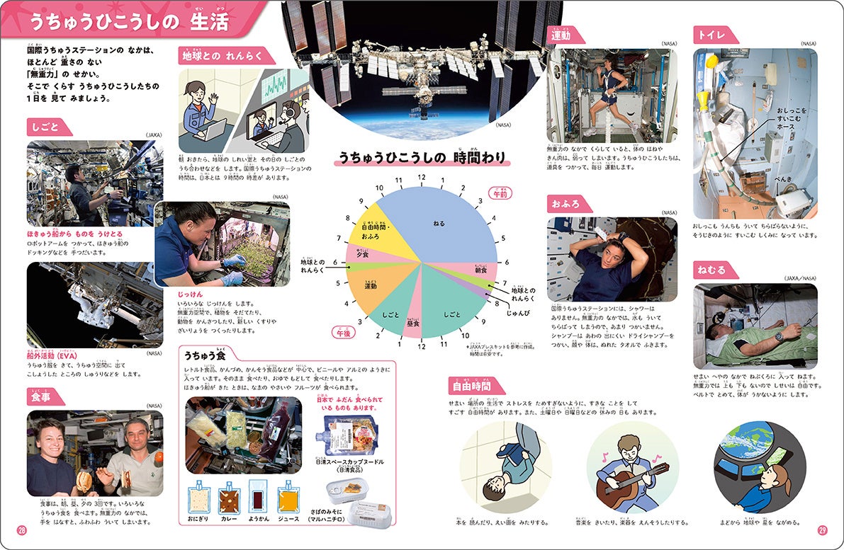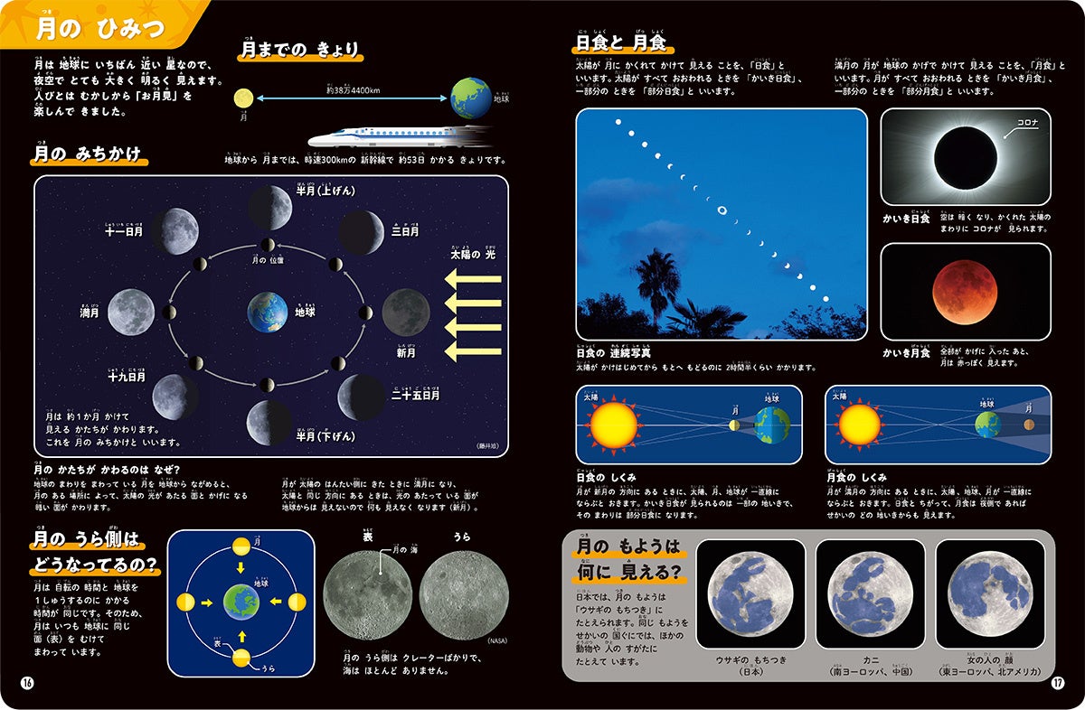 太陽系の惑星、地球の自転と公転、月の満ち欠け、世界各国のロケット、宇宙飛行士の生活など、宇宙のふしぎをくわしくていねいに解説しています。