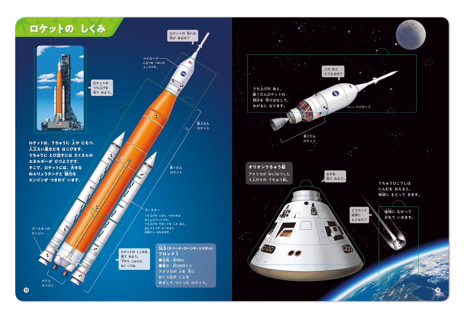 ロケットの構造は、アメリカNASAの新型ロケットSLS(スペース・ローンチ・システム)のメインエンジン、ブースターエンジン、燃料タンク、宇宙飛行士が乗るオリオン宇宙船などを、順にめくっていくことで確認できます。