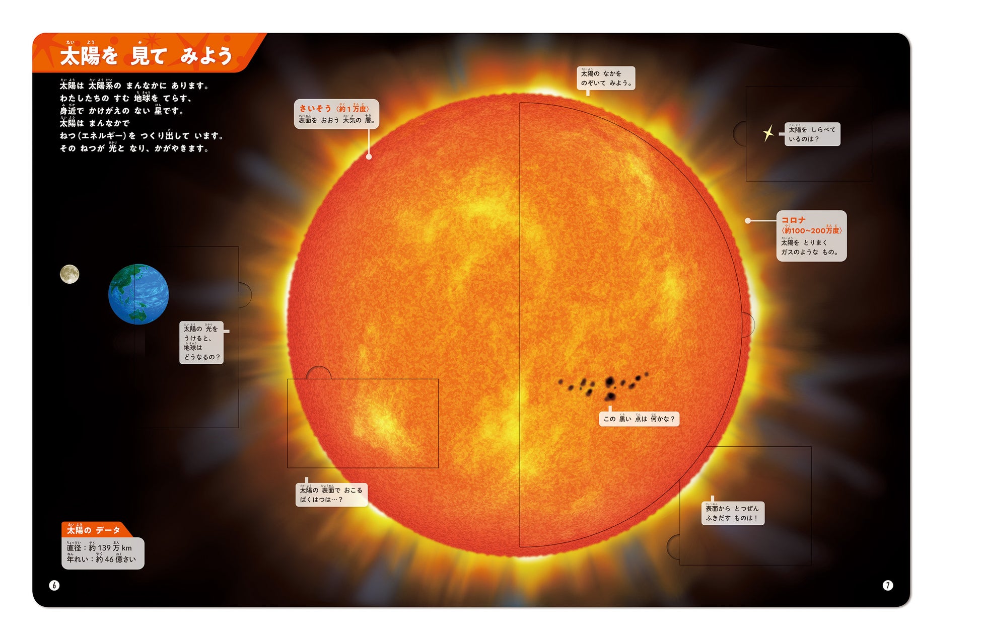しかけをめくると、太陽や月、地球などの天体の断面が見られたり、ロケットや宇宙服の構造が見られたり、天体と宇宙開発のしくみがわかります。