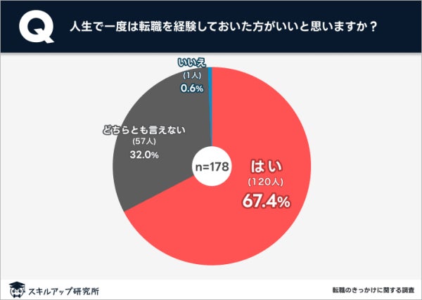 「人生で一度は転職を経験しておいた方がいいと思いますか?」という質問に対し、67.4%が「はい」と回答した。さらに、「いいえ」の回答はわずか0.6%で1人のみであった。