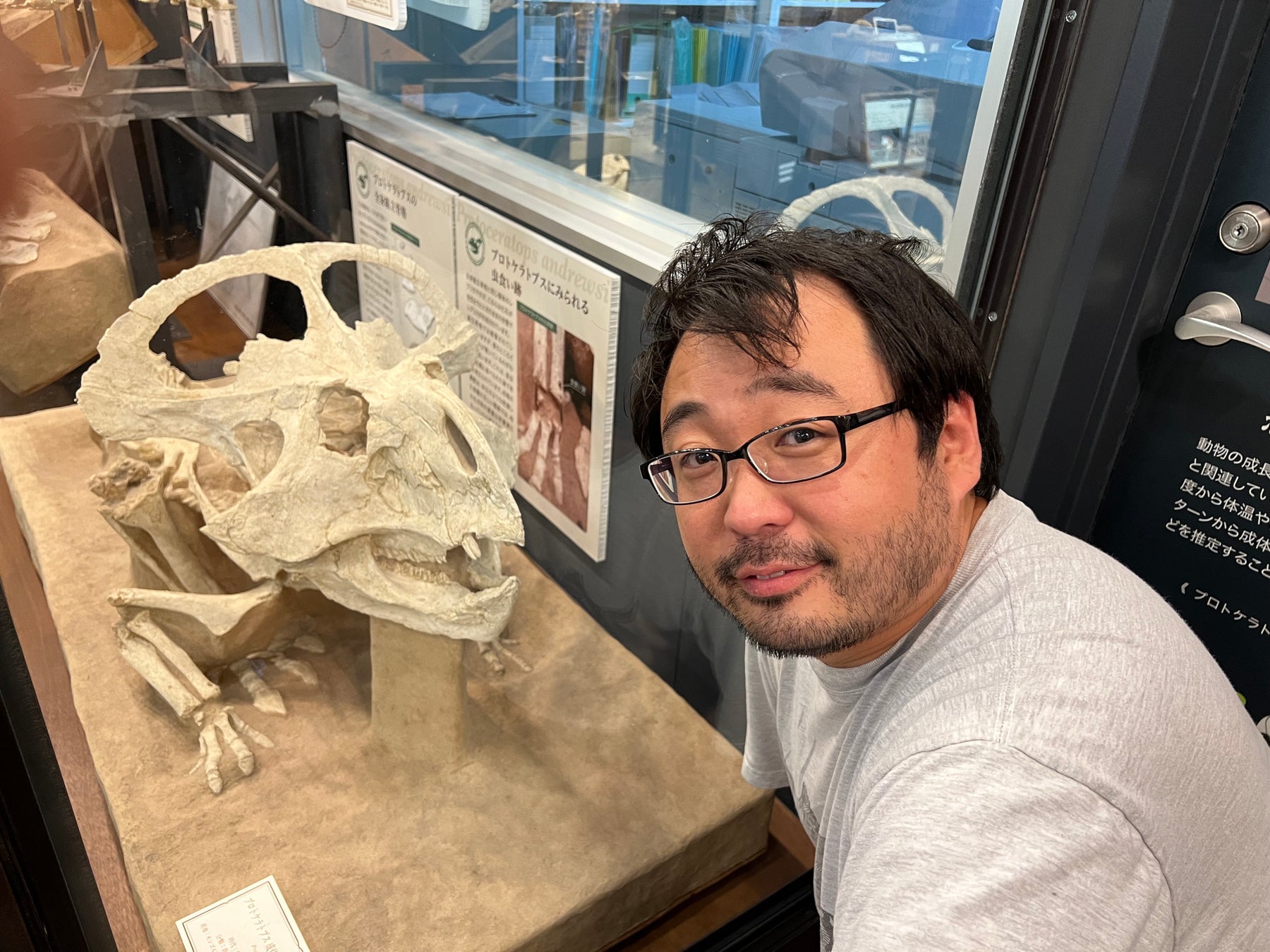 1985年、札幌市出身。岡山理科大学生物地球学部講師。東北大理学部卒、北海道大学大学院理学院修士課程修了、トロント大生態学進化生物学科で博士号取得。専門は角竜。ササヤマグノームスの発表にも参加!