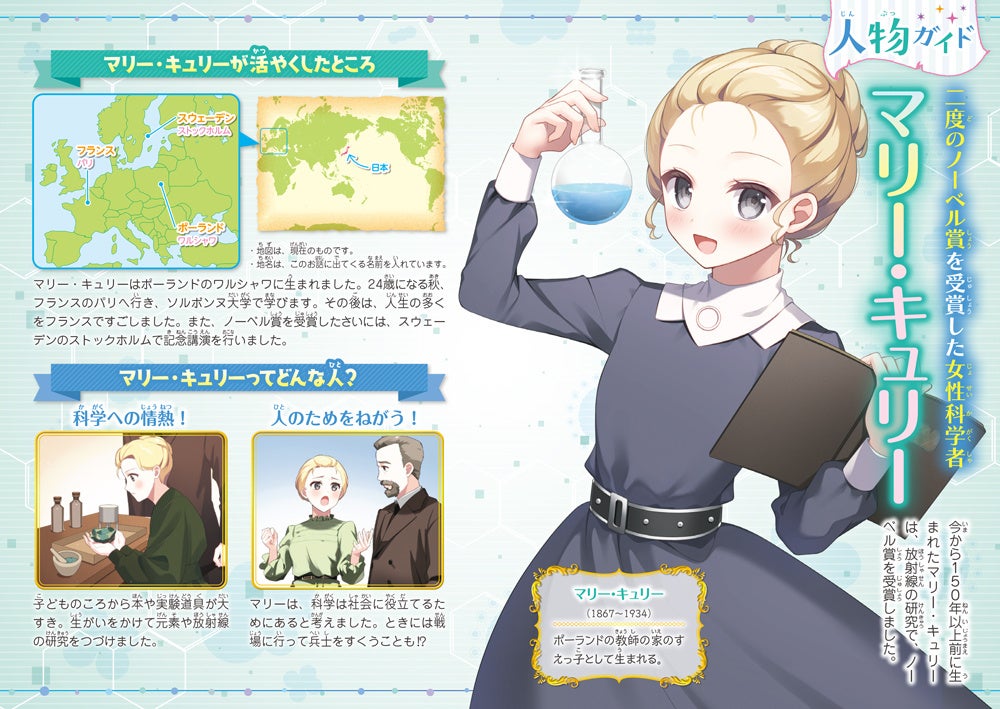 ポーランドで生まれたマリー・キュリーは、放射線の研究や、新しい元素の発見により、二度もノーベル賞を受賞しました。ほかにも、理科教室の実施や、レントゲン装置での人命救助なども行ったマリー。科学への情熱と、世の中への貢献をけっして忘れることのなかったマリーの人生にせまります。